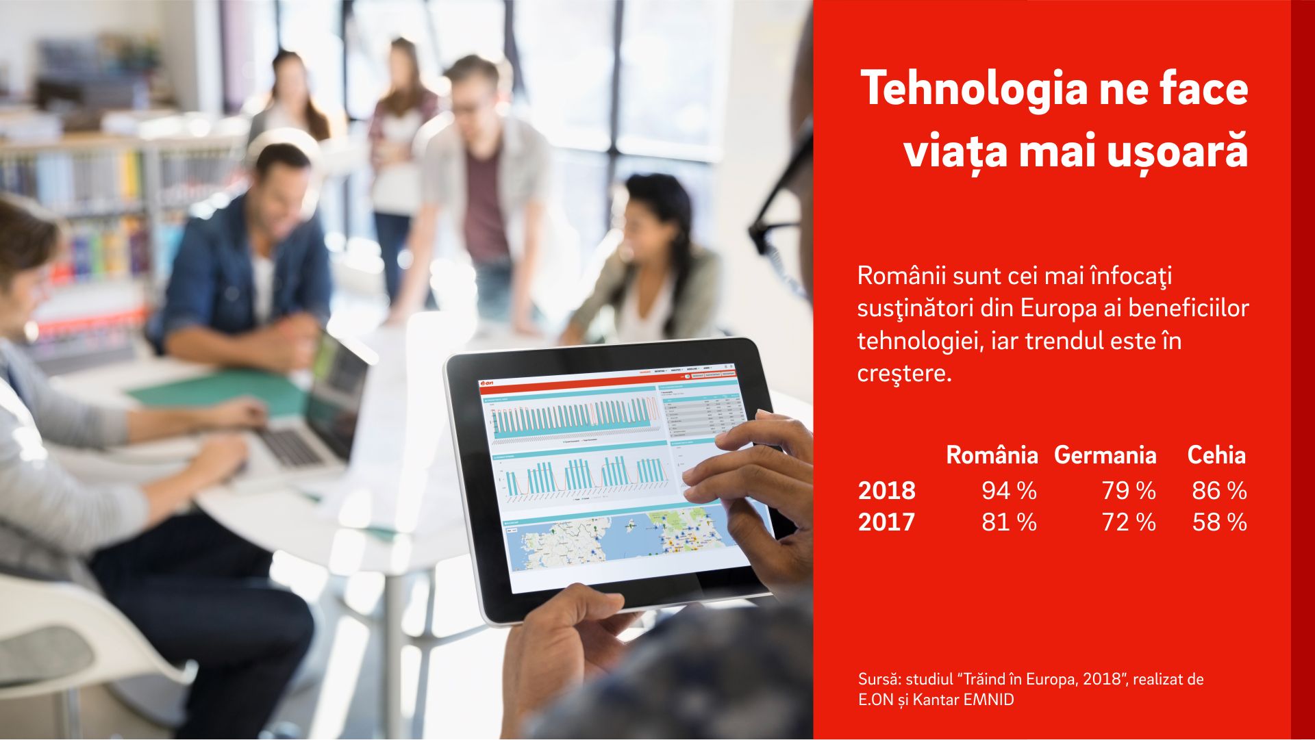 Tehnologia ne simplifica viata, afirma fara niciun dubiu 94% dintre românii chestionati in cadrul unui sondaj european realizat de E.ON si Kantar EMNID, convingere care ne situeaza cu mult peste media de 87% a europenilor care impartasesc aceeasi opinie.