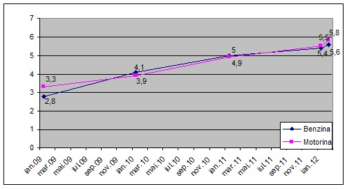 Evolutia pretului benzinei si motorinei: 12 ian. 2009 – 25 feb. 2012 (lei/litru)